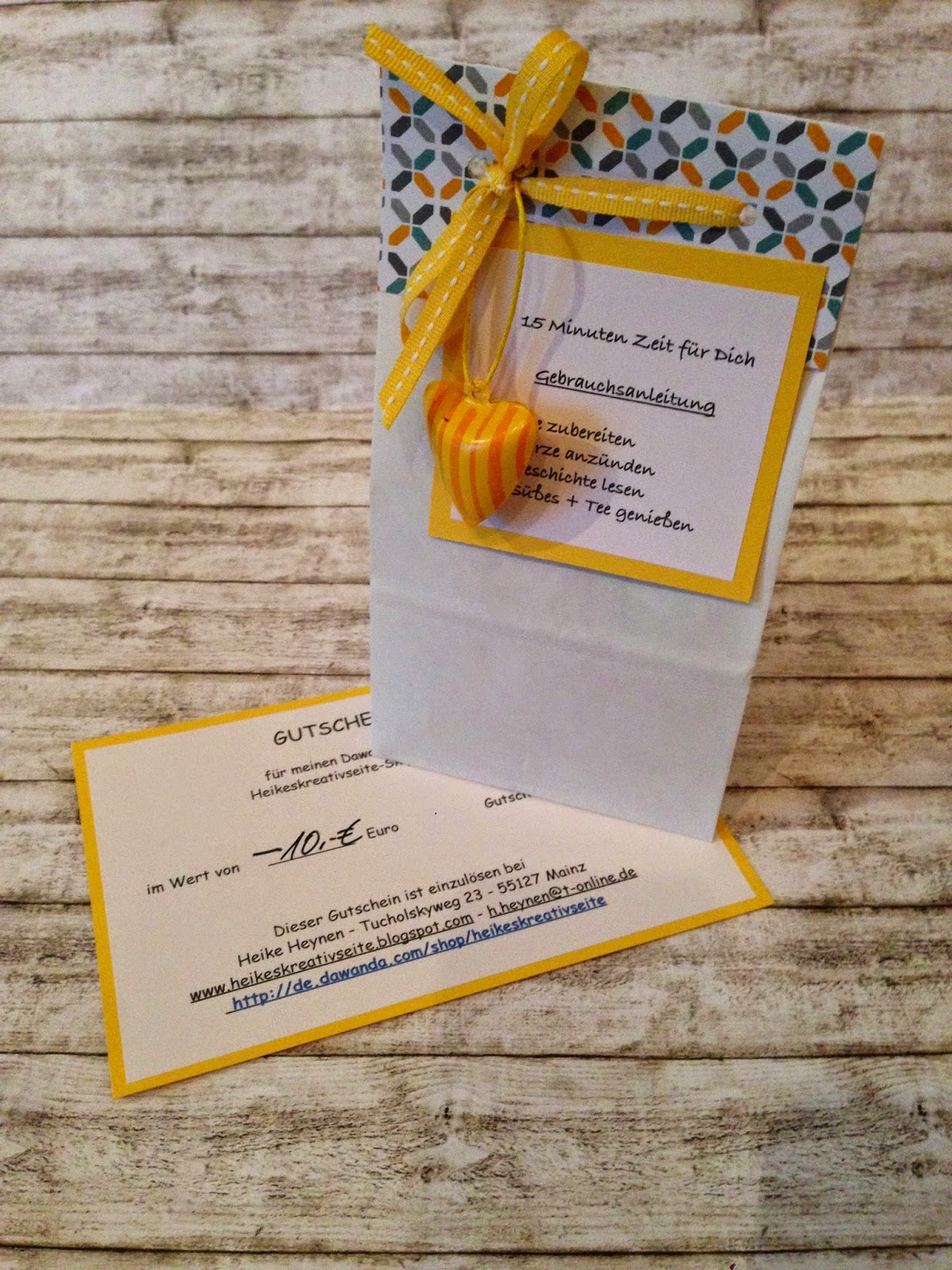 | Einmal 15 Minuten Zeit für dich + einem 10€ Gutschein für meinen Dawanda-Shop. |